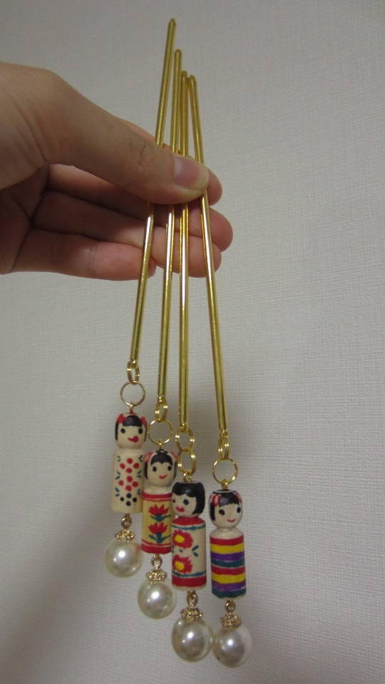 作ったといっても、こけし部分のみで、パールやかんざし部分は既製品です。