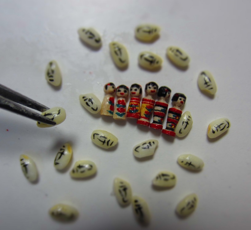 ニスが完全に乾いたら、爪楊枝こけしとこけしと書いたお米をビンの底に接着。