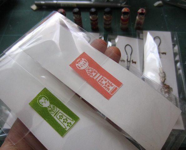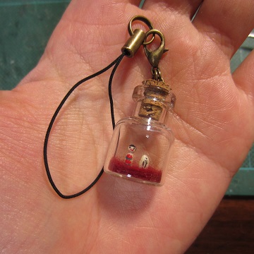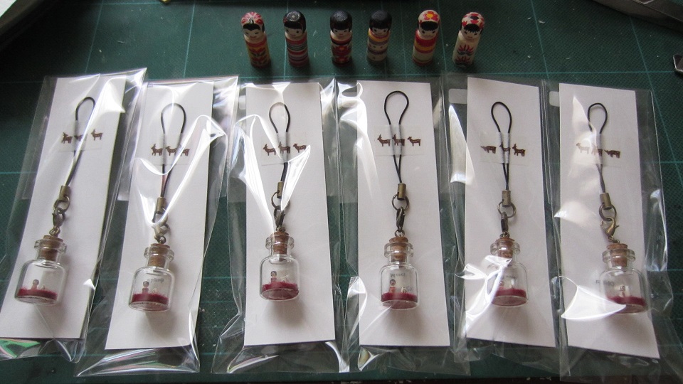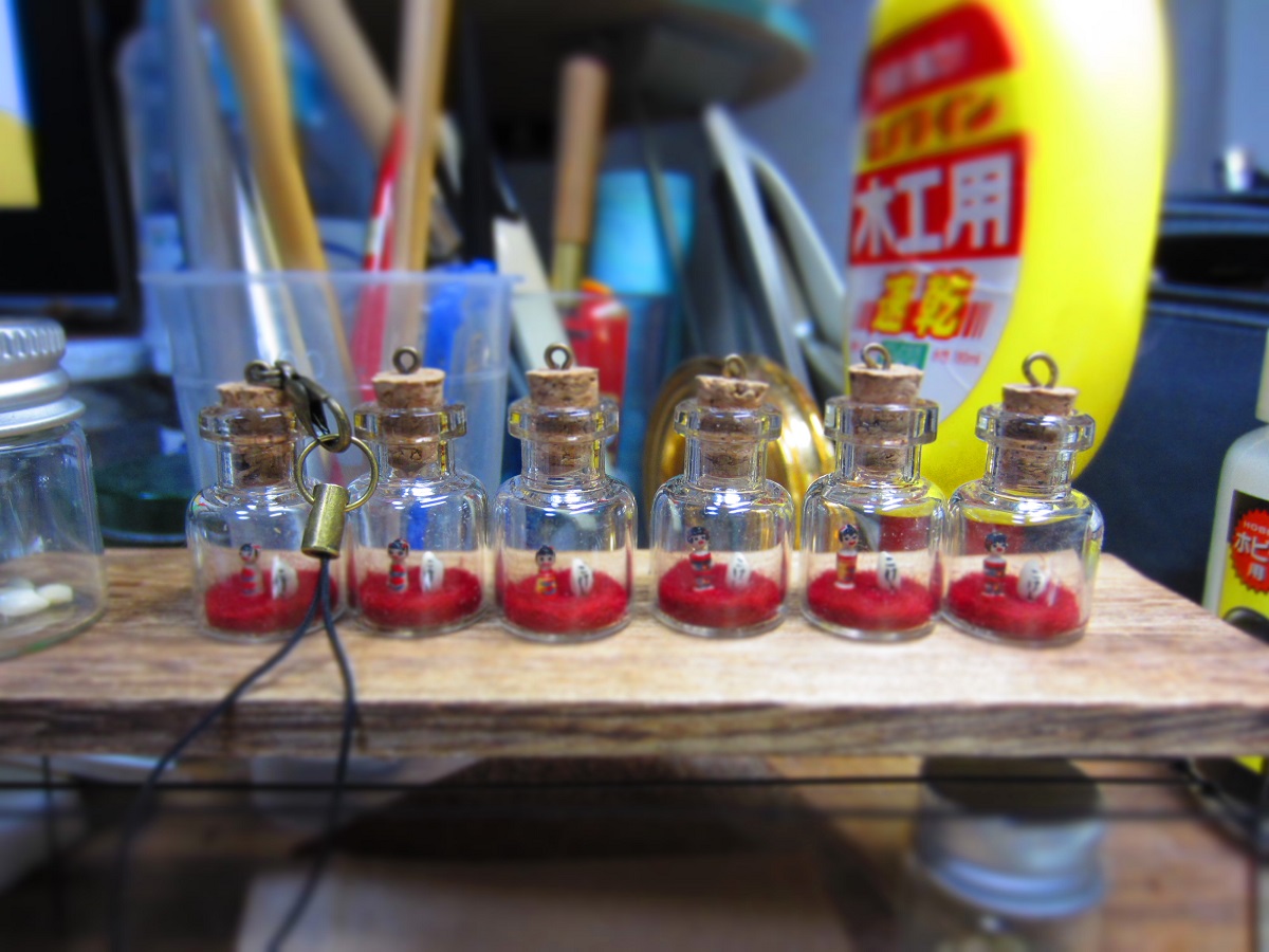 『こけしストラップ(ビン入り)』は、爪楊枝で作ったこけしを瓶に入れて、ストラップのアクセサリにしています。(“こけし”と書いた米粒も一緒に…)