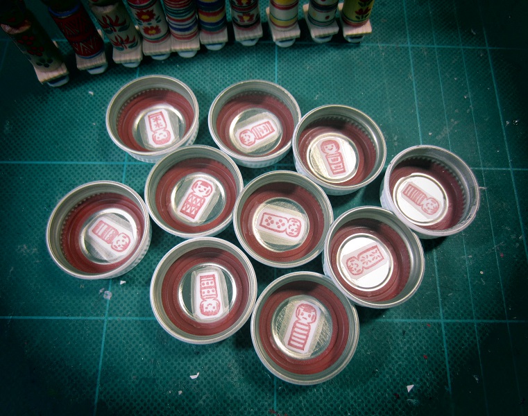 ニスが乾いたら、先ほどのはんこを捺したクラフト紙を木の持ち手に貼っていきます。