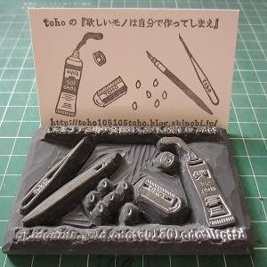 9月15日(土)の『私の好きなもの展』で、『ショップカード』ならぬ『ブログカード』を置こうと考えていまして、チマチマと消しゴムを彫って作りました。