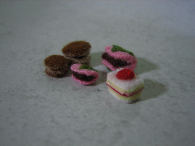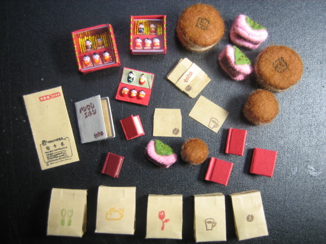 右上にある茶色やピンクのものは、フェルトで作ったどら焼きと桜餅です。
