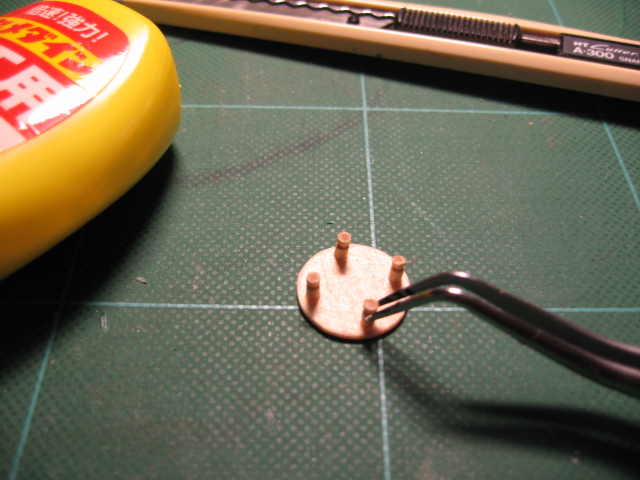 出来上がった丸い板に、爪楊枝を短く切ったもの(尖っていない方を使用)を4箇所にボンドで付けます。